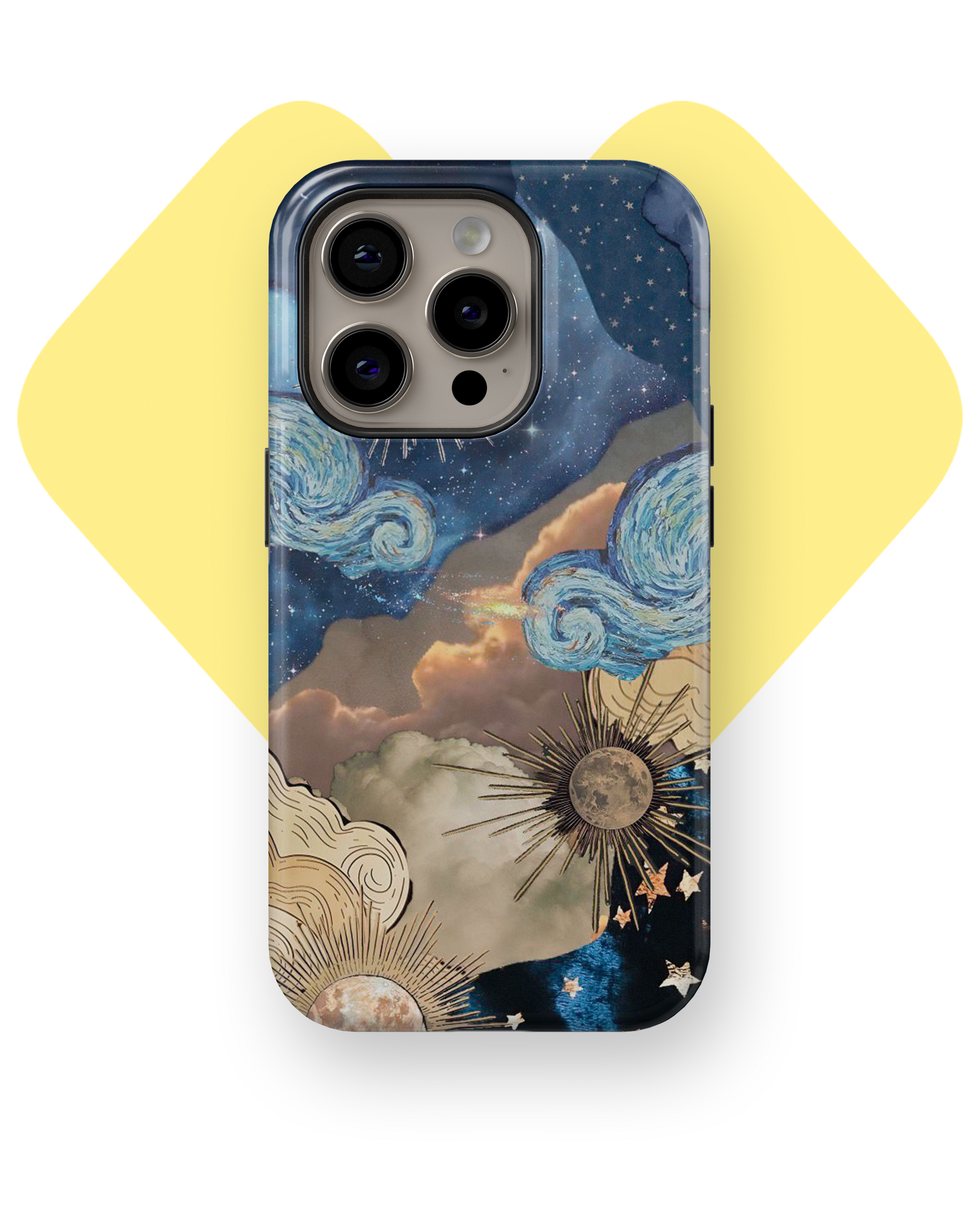 Esta funda de doble protección cuenta con una capa interna de TPU y una externa de policarbonato, diseñada para absorber impactos y resistir caídas. Su diseño astral representa la conexión del universo, las estrellas y el sol, ofreciendo un estilo único y lleno de energía. Protege tu dispositivo con seguridad mientras llevas contigo la magia y el misterio del cosmos.